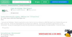 A rede de farmácias Raia Drogasil está com 238 oportunidades de vagas de emprego em aberto para diversos cargos e regiões do país. A RD – Gente Saúde e Bem-estar, empresa líder no mercado brasileiro de drogarias, com mais de 1.800 lojas em 22 estados brasileiros, foi criada em novembro de 2011 a partir da fusão entre Raia S.A. e Drogasil S.A. Com receita bruta de R$ 15,5 bilhões em 2018, a RD é a maior rede de drogarias do Brasil em receita e número de lojas.