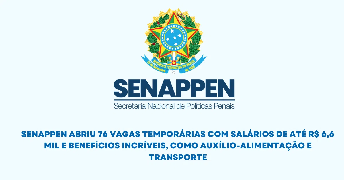 Não perca essa chance! A SENAPPEN abriu 76 vagas temporárias com salários de até R$ 6,6 mil e benefícios incríveis, como auxílio-alimentação e transporte. Contratos de até 4 anos e oportunidades em áreas estratégicas como Direito e Administração. Inscreva-se até 30 de dezembro e transforme sua carreira!