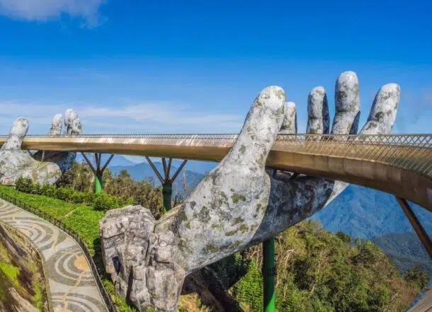 Suspensa a 1.400 metros de altura, a Ponte Dourada no Vietnã, com 150 metros de comprimento e balaustradas banhadas a ouro, é sustentada por mãos gigantes que parecem saídas de um conto de fadas.
