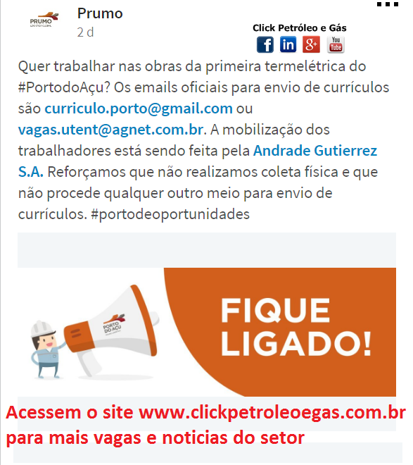 Hoje(19),a Prumo divulgou em nota oficial novos contatos de e-mails para todos os trabalhadores, «DISSEMOS TODOS» para se cadastrarem, pois serão muitas vagas em todas a modalidades profissionais, não importando se você tem ou não experiência, basta deter ensino fundamental, médio, técnico ou superior. Uma coisa o Click Petróleo e Gás pode falar com toda certeza: O pronunciamento é oficial e as obras durarão por pelo menos 2 anos. Vejam a publicação da empresa abaixo com os e-mails atualizados e funcionais para candidatura: