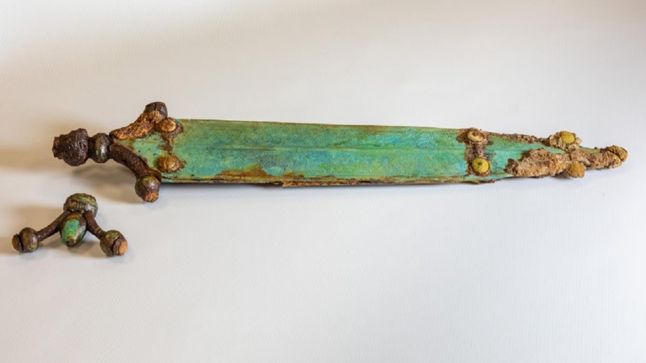 O artefato, datado entre o século IV e III a.C., estava acompanhado de pulseiras de liga de cobre e um vaso funerário. Ainda que nenhum esqueleto tenha sido identificado no local, a espada é considerada “o objeto mais espetacular da necrópole” por seu excelente estado de preservação e riqueza decorativa com pastas de vidro.