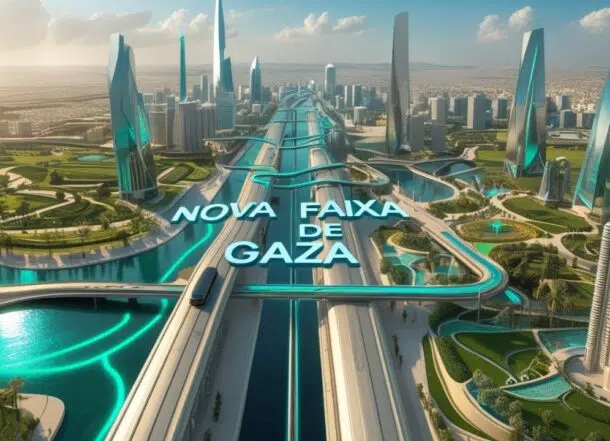 A proposta batizada de “Gaza 2035” pretende transformar a devastada Faixa de Gaza em um centro de desenvolvimento econômico e inovação. As imagens divulgadas mostram um cenário futurista, com: