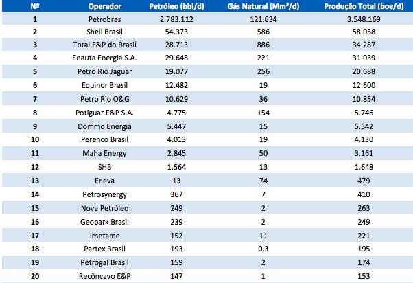 97,6% de toda produção nacional de petróleo e 86% da produção de gás vieram de exploração offshore. Campos operados pela Petrobras, em consórcio ou não, produziram 94,9% do petróleo e gás natural.