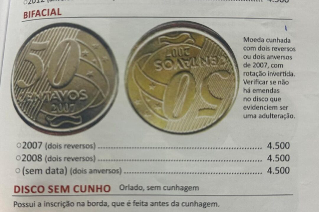 Para colecionadores e entusiastas, encontrar uma moeda bifacial de cinquenta centavos pode significar um verdadeiro tesouro. O valor dessa moeda pode chegar até a R$ 4.500, de acordo com o catálogo de Moedas com Erros de 2023.