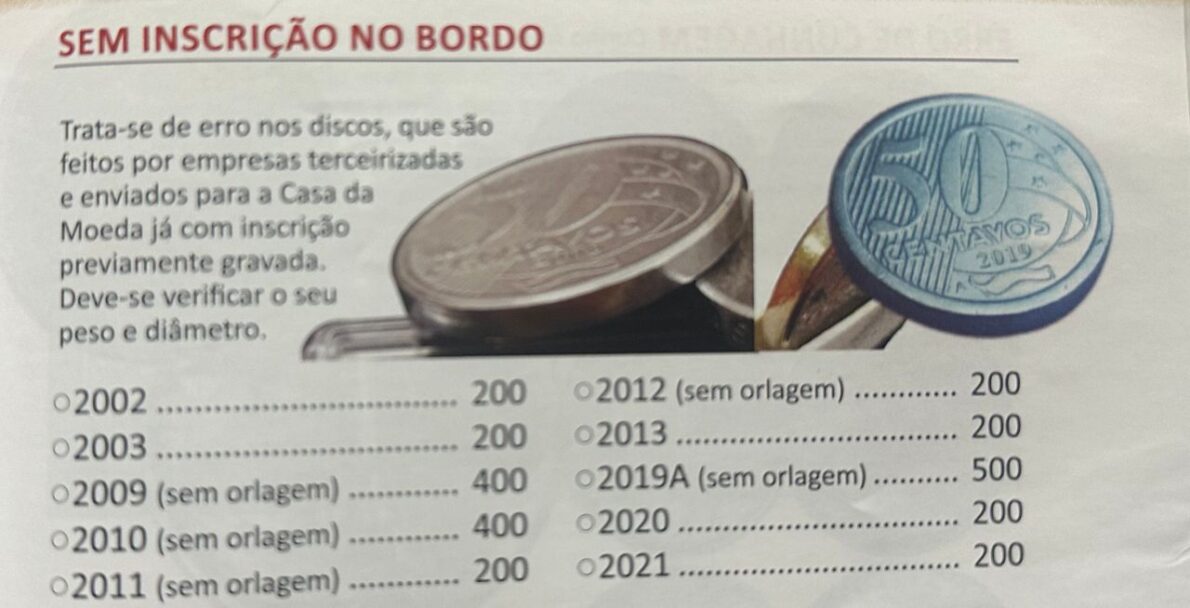 Outro exemplar que pode estar escondido nas gavetas dos brasileiros é a moeda de cinquenta centavos sem inscrição no bordo. As moedas de cinquenta centavos, na sua versão mais comum, apresentam uma inscrição ao redor da borda. No entanto, algumas foram cunhadas sem essa marca, o que as torna raras e procuradas por colecionadores.