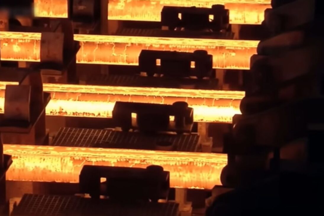 Em seguida, os blocos seguem para a linha de laminação, onde rolos gigantes começam a “amassar” o aço até ele virar o perfil clássico de trilhos ferroviários.