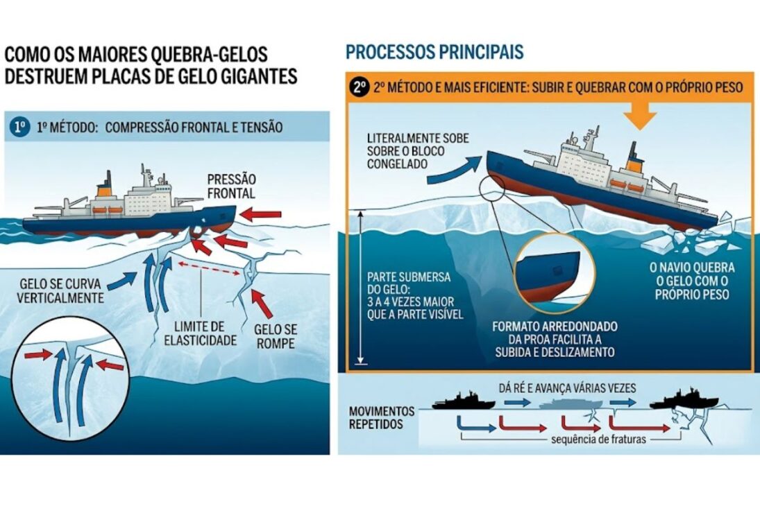 É justamente nesse ponto que entram os maiores quebra-gelos. Esses navios possuem uma proa desenhada especificamente para escalar o gelo. Em vez de tentar esmagar diretamente a placa congelada, o casco sobe sobre ela e utiliza o peso da embarcação para provocar flexão e ruptura.