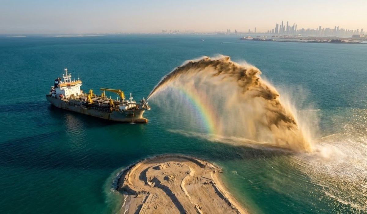 Projeto bilionário redesenhou o mapa de Dubai com engenharia marítima de larga escala, ampliando a área costeira e impulsionando o turismo e o mercado imobiliário por meio de uma ilha artificial construída sobre areia dragada e rochas.
