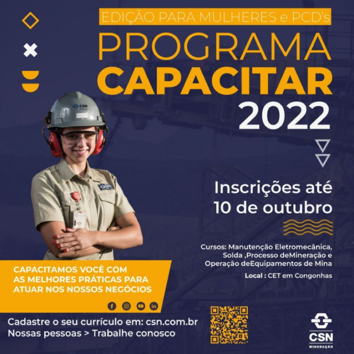 CSN Mineração e Metais abre inscrições para cursos gratuitos de qualificação profissional com certificados no seu Programa Capacitar 2022.