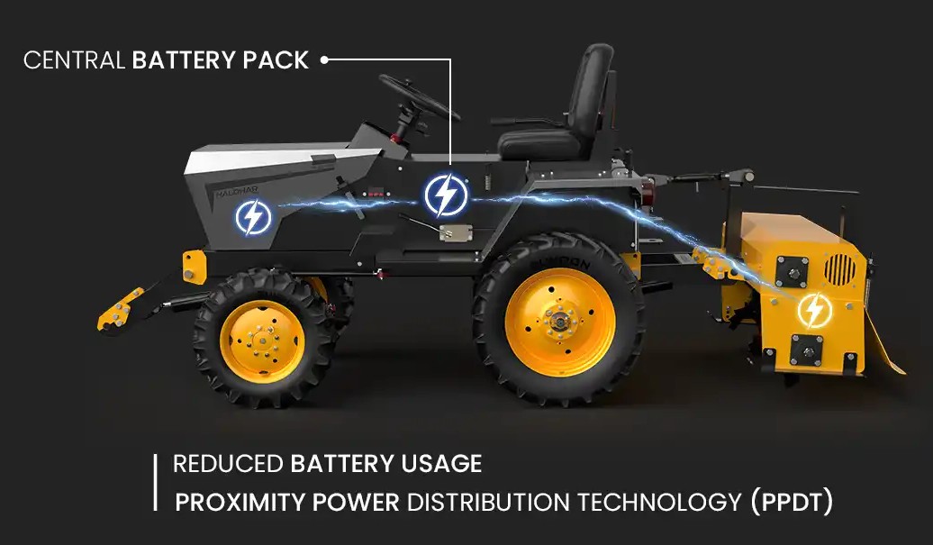 Com uma bateria de 9,6 kW, o Haldhar MUT-eV oferece energia suficiente para operar diversos implementos agrícolas.