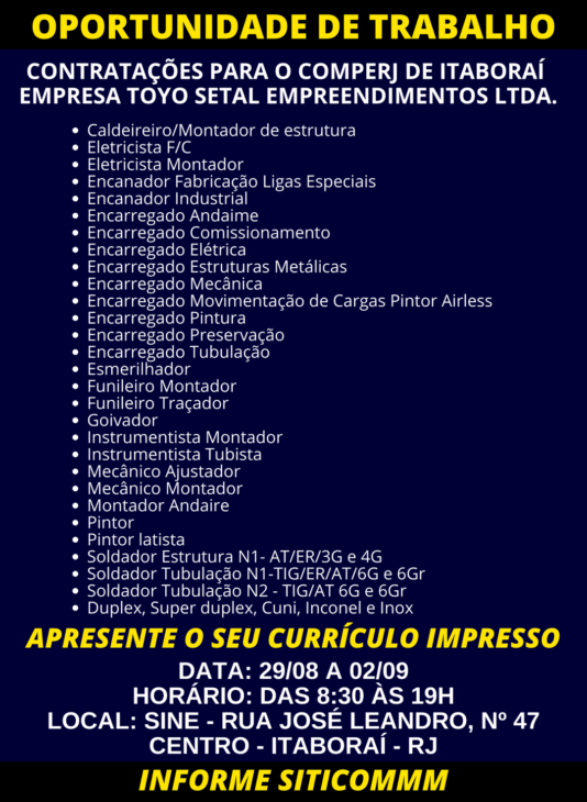 Inscrição: os interessados em concorrer às vagas de emprego abertas pela Toyo Setal para brasileiros do COMPERJ, devem levar o currículo impresso até sexta-feira (02/09), das 8h30 às 19h, no endereço: SINE – Rua José Leandro, n 47, centro, Itaboraí – RJ.