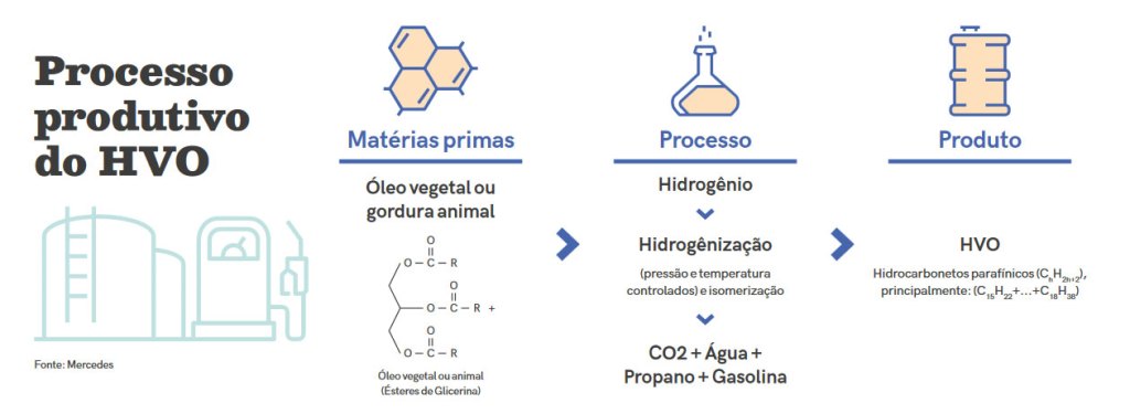 O HVO é um combustível que, assim como o biodiesel, pode ser produzido a partir de óleos vegetais, como óleo de palma, de soja, de girassol, óleo alto (de aparas de madeira), gorduras residuais (óleo de cozinha) e gorduras animais. Mas, para produzir especificamente o HVO, os óleos devem entrar em contato com hidrogênio sob alta pressão, e só então é criado o combustível. Esse processo possibilita obtê-lo a partir de uma maior variedade de matérias-primas que não competem com a produção de alimentos.