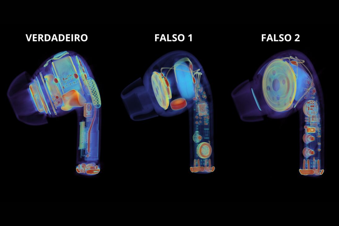 Foi exatamente esse universo que a empresa de tecnologia Lumafield decidiu explorar ao usar tomografia industrial para escanear lado a lado um par de AirPods Pro genuínos e dois pares falsificados. O resultado chamou atenção internacional, não apenas pela clareza das imagens, mas pelo que elas revelam sobre a engenharia real da Apple e os atalhos adotados pelas cópias.