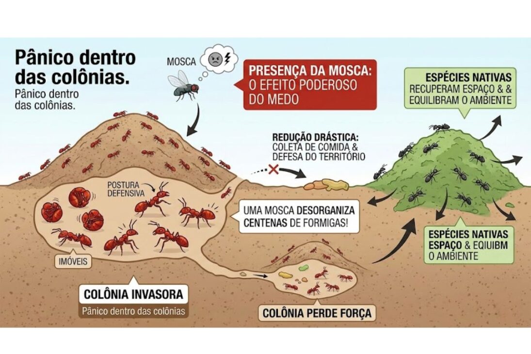 Pesquisadores usam moscas parasitoides contra formigas invasoras que devastam ecossistemas, lavouras e cidades, espalham prejuízos bilionários e resistem a venenos, enquanto o controle biológico provoca pânico nas colônias e enfraquece a expansão dessas pragas em diversos países atualmente.