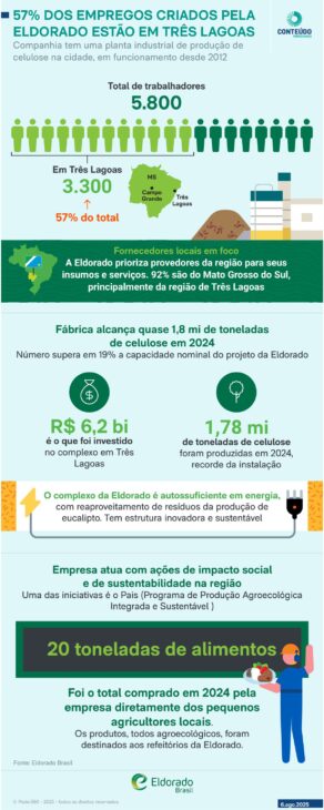 Além da geração de empregos — cerca de 3.300 colaboradores diretos só na unidade de Três Lagoas —, a Eldorado também contribui com a formação de mão de obra. A companhia oferece bolsas de estudos em parceria com 50 instituições educacionais e colabora com o Senai local para garantir capacitação profissional em diversas áreas industriais.