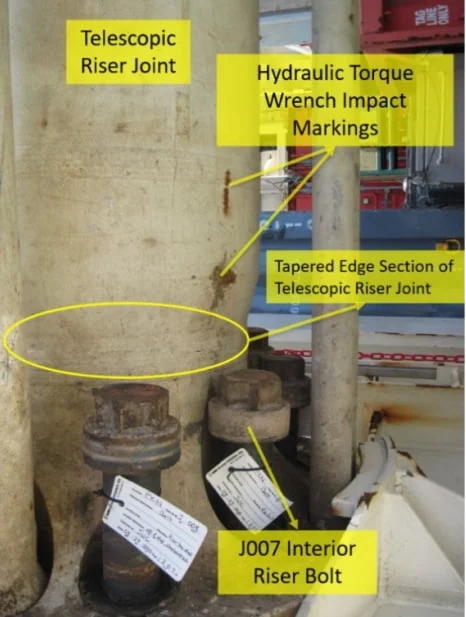 De acordo com a BSEE, a investigação do incidente apurou que a equipe da plataforma de petróleo e gás estava utilizando uma chave de torque hidráulica para extrair os parafusos de um flange da junta telescópica do riser (TJ).
