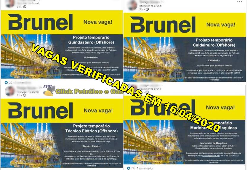 Em meio a pandemia, a Brunel Recrutamento e Seleção inicia vagas para embarque IMEDIATO com cadastro de currículo até 20 de abril. As oportunidades abertas ontem (15) e hoje 16 de abril são para trabalhar em multinacional do petróleo. Soldador, Mecânico, Caldeireiro e Técnico requisitados para vagas em parada de manutenção em mineradora; início em 19 de maio