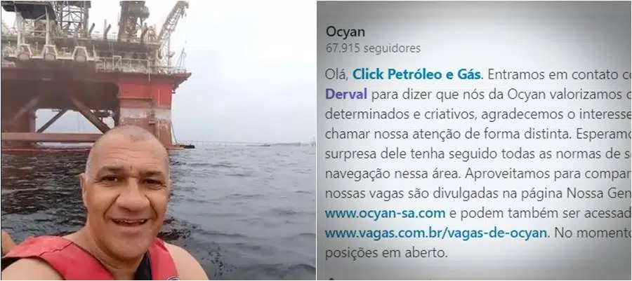 «Olá, Click Petróleo e Gás. Entramos em contato com o Carlos Derval para dizer que nós da Ocyan valorizamos candidatos determinados e criativos, agradecemos o interesse dele e a iniciativa de chamar nossa atenção de forma distinta. Esperamos que a visita surpresa dele tenha seguido todas as normas de segurança para navegação nessa área. Aproveitamos para compartilhar que todas nossas vagas são divulgadas na página Nossa Gente em nosso site www.ocyan-sa.com e podem também ser acessadas pelo www.vagas.com.br/vagas-de-ocyan. No momento, estamos com 3 posições em aberto. «
