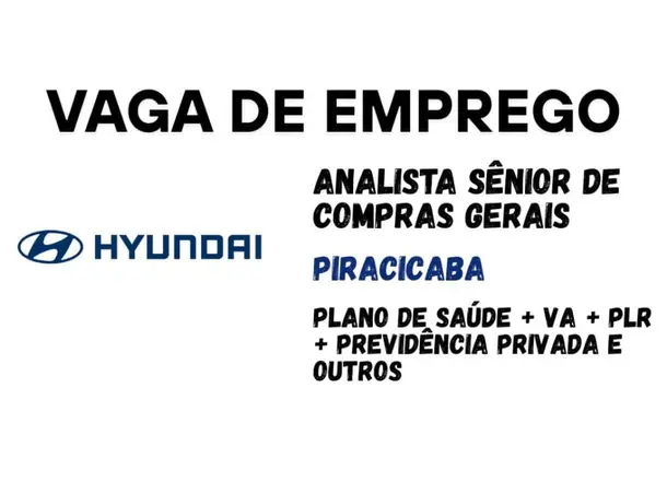 Se você tem experiência com compras industriais, inglês avançado e quer fazer parte de uma montadora global, a Hyundai Motor Brasil está com vaga aberta para Analista Sênior de Compras em Piracicaba. A empresa oferece benefícios como plano de saúde, vale-alimentação, PLR e previdência privada.