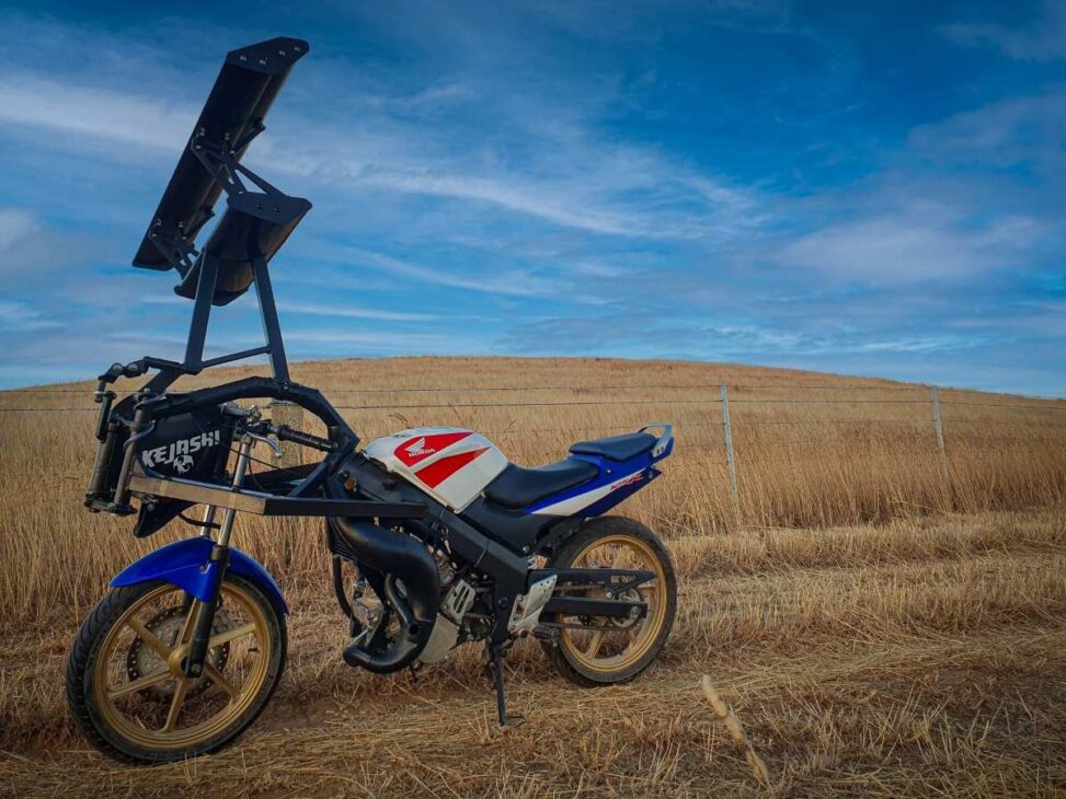 Motocicleta Kejashi, criada por Kent James Shillitoe, combina asa oscilante e direção deslocada para aumentar a estabilidade e aderência mesmo em curvas extremas.