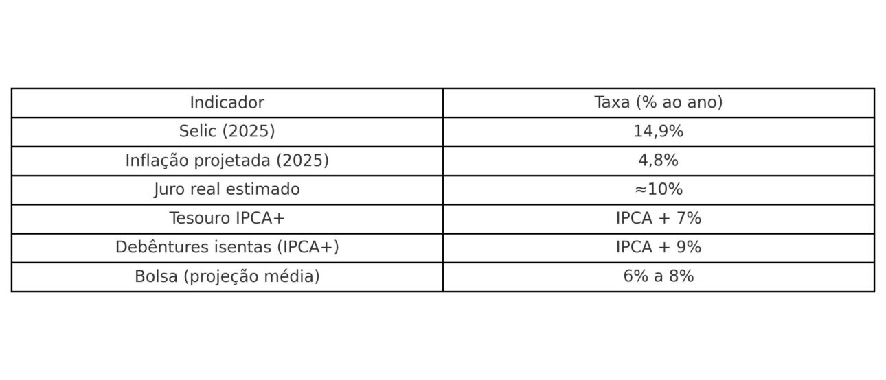 Na prática, a perspectiva de juros altos por mais tempo mantém a renda fixa entre as aplicações mais atrativas. Títulos do Tesouro IPCA+ oferecem taxa real próxima de 7% ao ano, enquanto debêntures isentas chegam a IPCA+9%. Esses retornos são superiores aos de muitos ativos internacionais e garantem proteção contra a inflação.