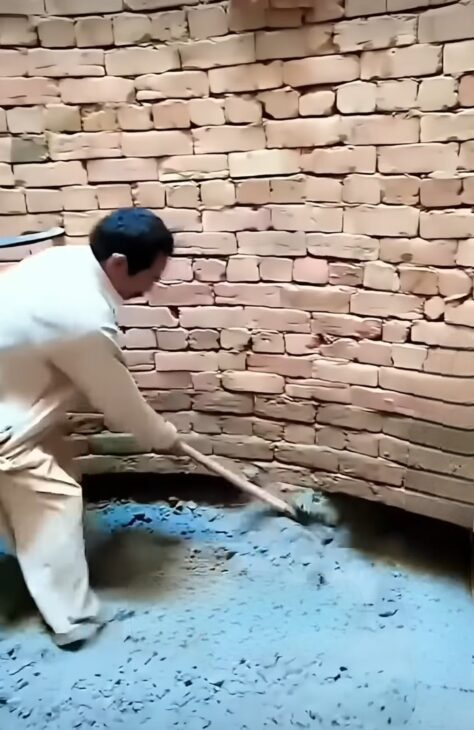 Essa movimentação gradual torna o processo mais seguro, porque evita desmoronamentos, mantendo as paredes estáveis enquanto o poço se aprofunda. O trabalhador repete o ciclo: escava, remove o solo, observa a estrutura afundar e continua o trabalho.