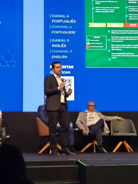 Claudia Belchior, gerente do Departamento de Relações Comunitárias e Responsabilidade Social Corporativa da MRN, compartilhou as experiências da empresa com as Consultas Livres, Prévias e Informadas, realizadas em dois territórios quilombolas, e a implementação de um robusto plano de comunicação que envolve mais de 60 comunidades ribeirinhas e rurais, instituições representativas, imprensa e outros stakeholders. A gerente mencionou os desafios e os aprendizados do processo de licenciamento do Projeto Novas Minas (PNM), cujo objetivo é prorrogar as operações da MRN por mais 15 anos, destacando o fortalecimento do diálogo com as diversas comunidades e o respeito à legislação ambiental que resultou na obtenção da licença prévia pelo Ibama em setembro.
