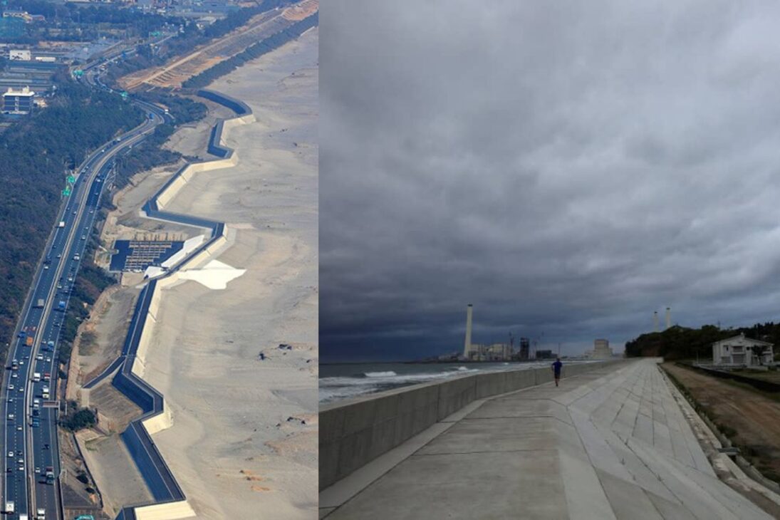 A Muralha do Japão é um sistema contínuo de defesas costeiras com fundação mergulhando até 20 m no subsolo para resistir a impactos extremos.