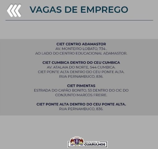 Veja, abaixo, uma breve descrição que o Click Petróleo e Gás preparou sobre as vagas de emprego que estão sendo ofertadas pela prefeitura de Guarulhos nesta quarta-feira, 10 de agosto.