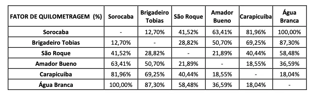 Por exemplo, uma viagem entre Sorocaba e São Roque (uma das rotas intermediárias) será cerca de 41,52% do valor da tarifa do trem expresso.