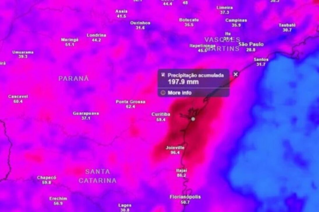 A projeção aponta um cenário que combina deslocamento gradual do sistema ao longo do dia e aumento de instabilidade, com volumes que podem se concentrar em áreas específicas. Em dois trechos do Sul, o sinal de atenção se fortalece: o leste do Paraná (do litoral à Grande Curitiba) e o Litoral Norte de Santa Catarina, onde a chuva pode alcançar acumulados elevados e gerar transtornos.