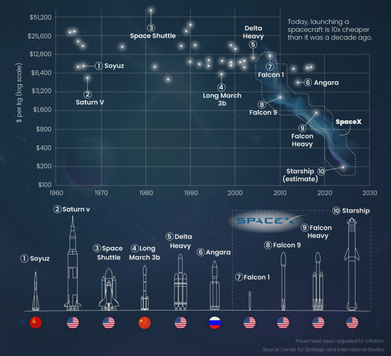 Em comparação, cada lançamento do Falcon 9 tem um custo marginal interno estimado de apenas 15 milhões de dólares. Isso significa que a SpaceX opera com uma taxa de voo 30 vezes maior que a do ônibus espacial, a apenas um centésimo do custo.