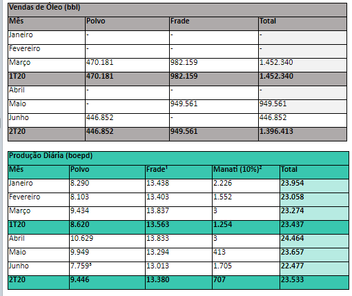 A produção diária de 23,5 mil barris segue em linha com a produção mensal da empresa, nos seis primeiros meses do ano. Confira as tabelas abaixo: