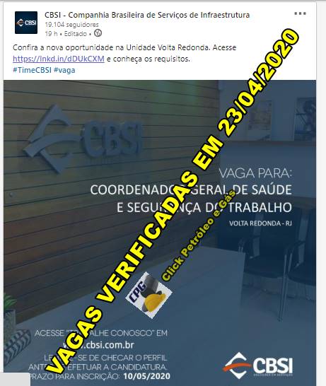 Segurança do Trabalho: a Companhia Brasileira de Serviços de Infraestrutura, está com vagas de ensino superior nos cargos Coordenador Geral de Saúde e Segurança do Trabalho e Médico do Trabalho para Volta Redonda e no Porto de Itaguaí. Vagas de ensino médio e superior para profissionais da área de logística e industrial, hoje 23 de abril