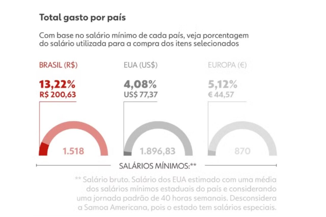 Um levantamento do g1 comparou o gasto de consumidores no Brasil, Estados Unidos e Portugal com uma cesta de produtos comuns aos três países. A análise é apenas ilustrativa, já que não considera hábitos médios de consumo, mas ajuda a mostrar o tamanho da diferença no peso dos preços sobre o orçamento.