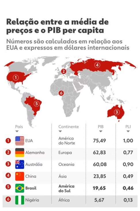 O PLI mostra que o Brasil tem preços médios mais altos do que 52 por cento das 192 nações avaliadas. Em teoria, países ricos costumam ter preços maiores, mas o Brasil se destaca como um ponto fora da curva. Mesmo com renda mais baixa, o país pratica valores que chegam a superar os de economias mais desenvolvidas.