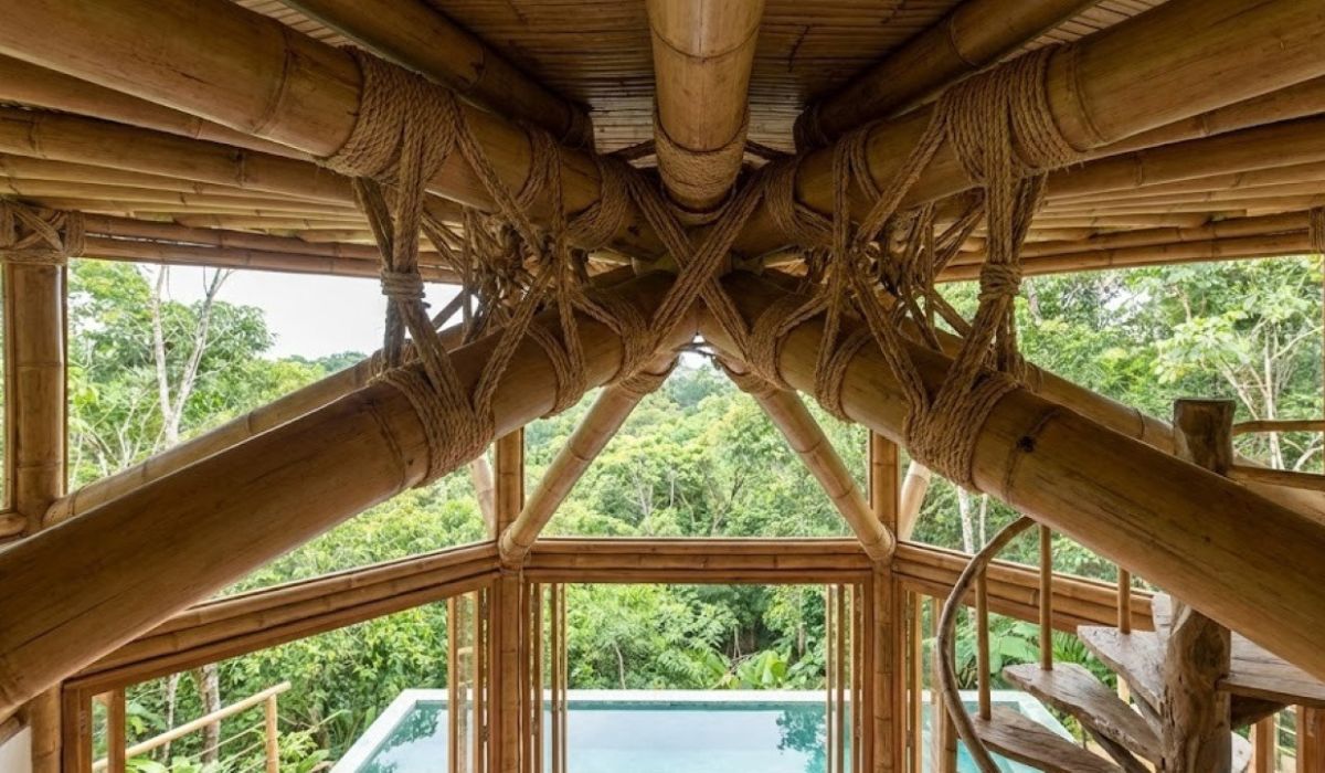 Um vídeo que circula nas redes sociais mostra a construção de uma casa de bambu de dois andares, com piscina integrada, erguida em área de mata sem o uso de ferramentas elétricas, pregos ou cimento.