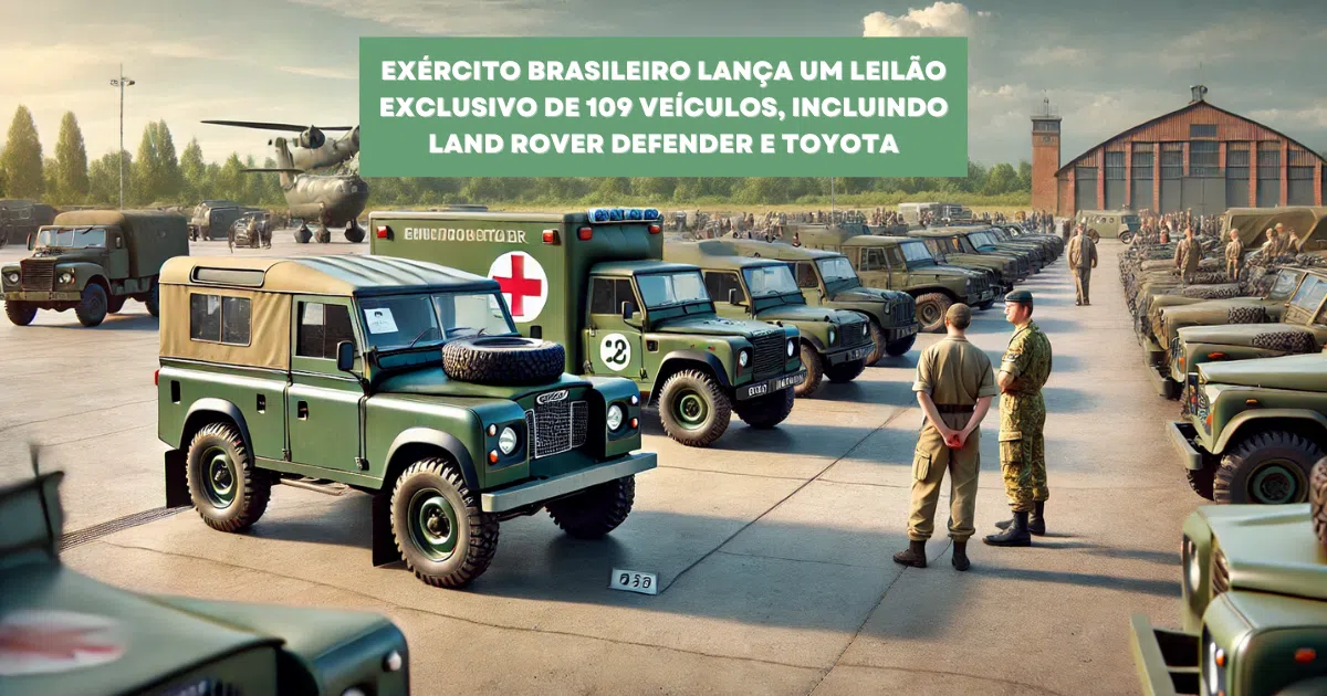 Exército Brasileiro lança leilão exclusivo de 109 veículos, incluindo Land Rover Defender e Toyota Bandeirante Ambulância, com lances iniciais surpreendentemente baixos.