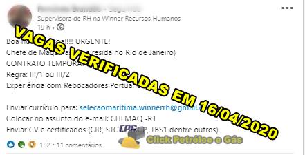 A empresa de recursos humanos Winner RH anunciou ontem (16) nova oportunidade de trabalho para marítimo morador do Rio de Janeiro se candidatar ao cargo de Chefe de Máquinas para embarque IMEDIATO em atividades de óleo e gás. Soldador, Mecânico, Caldeireiro e Técnico requisitados para vagas em parada de manutenção em mineradora; início em 19 de maio