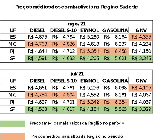 Além da gasolina, o Rio de Janeiro registrou o etanol mais caro da região, a R$ 5,354, embora o aumento de 0,22% em relação ao fechamento de julho tenha sido o mais baixo do Sudeste. Em Minas Gerais, o diesel e diesel S-10 apresentaram os valores mais altos por litro, a R$ 4,763 o tipo comum, e R$ 4,826 o S-10. No Espírito Santo, o gás natural veicular (GNV) mais caro foi comercializado a R$ 4,355 o metro cúbico.