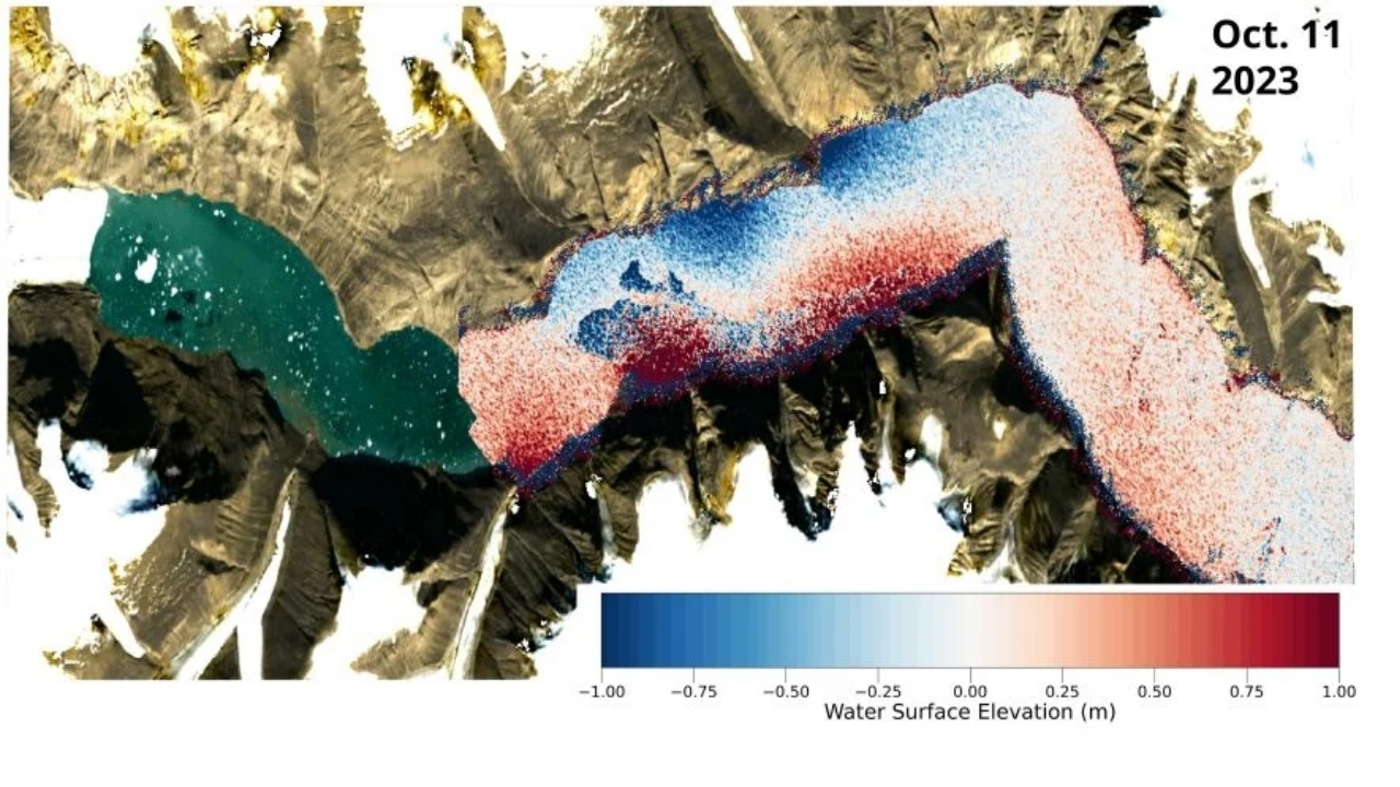 Os dados do satélite mostraram que a superfície da água dentro do fiorde apresentava inclinações bem marcadas, com diferenças de altura de até 2 m em momentos distintos.