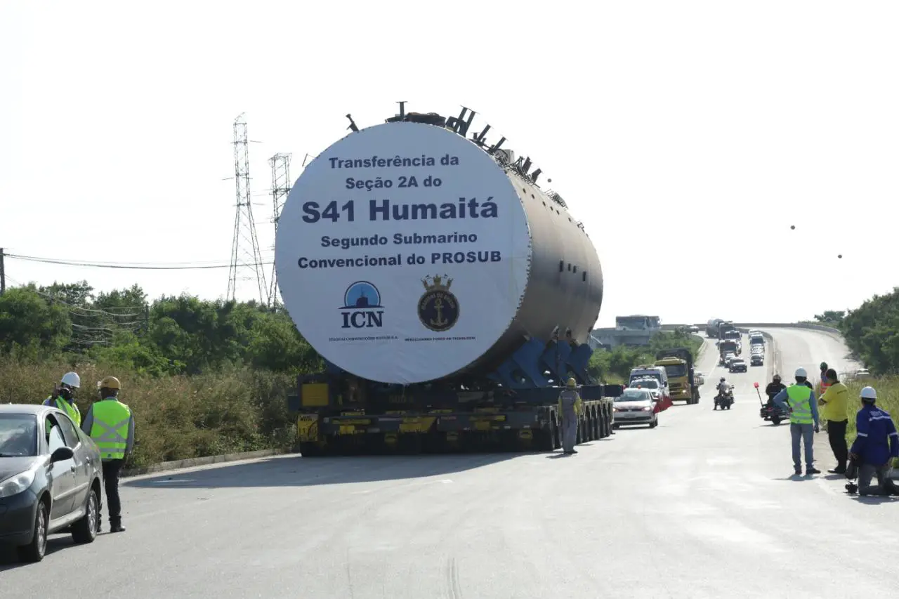 Na última quarta-feira, dia 29 de maio, foi realizada a operação de transferência via terrestre, da segunda das quatro seções do segundo submarino do PROSUB, que serão transportadas da UFEM para o Estaleiro de Construção do Complexo Naval de Itaguaí, o ICN, no rio de Janeiro.