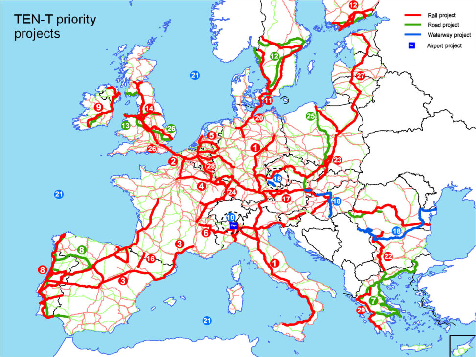 Embora os túneis suíços sejam tecnicamente suíços, seu impacto é continental e seu financiamento também. A União Europeia classificou os corredores alpinos como parte da Trans-European Transport Network (TEN-T) — uma malha ferroviária, portuária e rodoviária que pretende reorganizar o transporte europeu até meados da década de 2040.