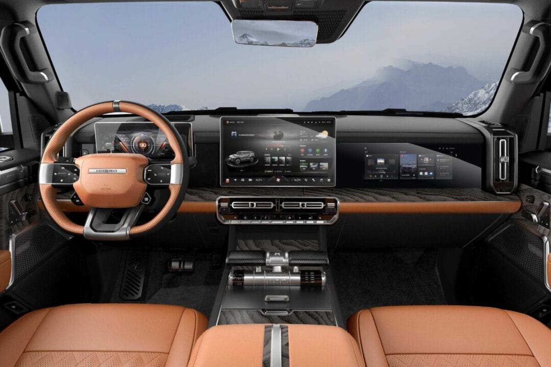 O Dongfeng M-Hero 917 destaca-se por seu design robusto e imponente, que parece esculpido diretamente de uma rocha, com linhas exteriores marcantes e uma estética dominada por formas geométricas e vincos acentuados. Este SUV elétrico vai além de uma simples aparência robusta, incorporando características típicas de veículos militares.