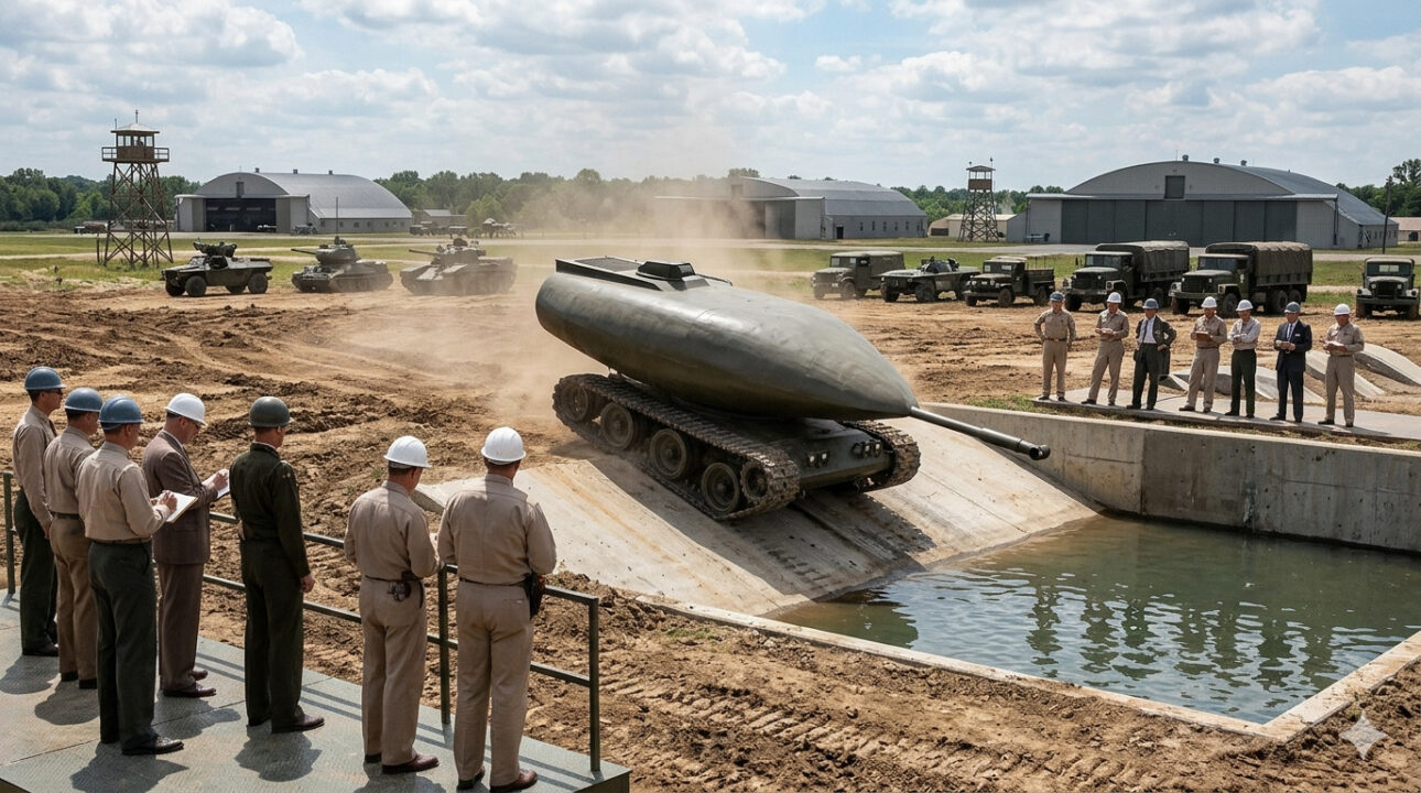 Outro aspecto curioso do projeto era a capacidade anfíbia. A torre cápsula era totalmente selada e funcionaria como um casco flutuante. Isso permitiria que o tanque atravessasse rios e áreas alagadas sem precisar de pontes ou veículos de engenharia.