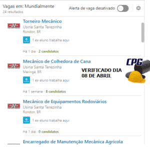 Descrição: Na lavoura, realizar a manutenção preventiva e corretiva em equipamentos agrícolas como: colhedora de cana, tratores e caminhões.
