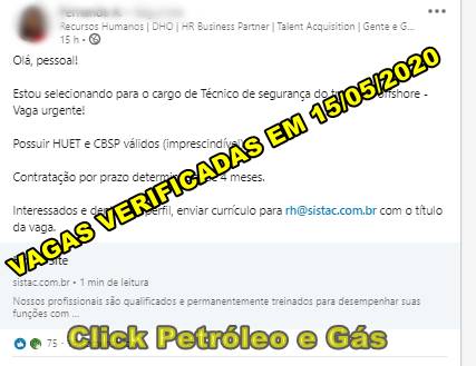 Em meio a pandemia, Técnicos de Segurança do Trabalho, são convocados para vaga de emprego URGENTE pela Sistac, líder no segmento de inspeção, manutenção e reparo offshore na indústria de óleo e gás no Brasil. Processo seletivo para Soldadores, Encanadores, Caldeireiros e mais, hoje 15 de maio
